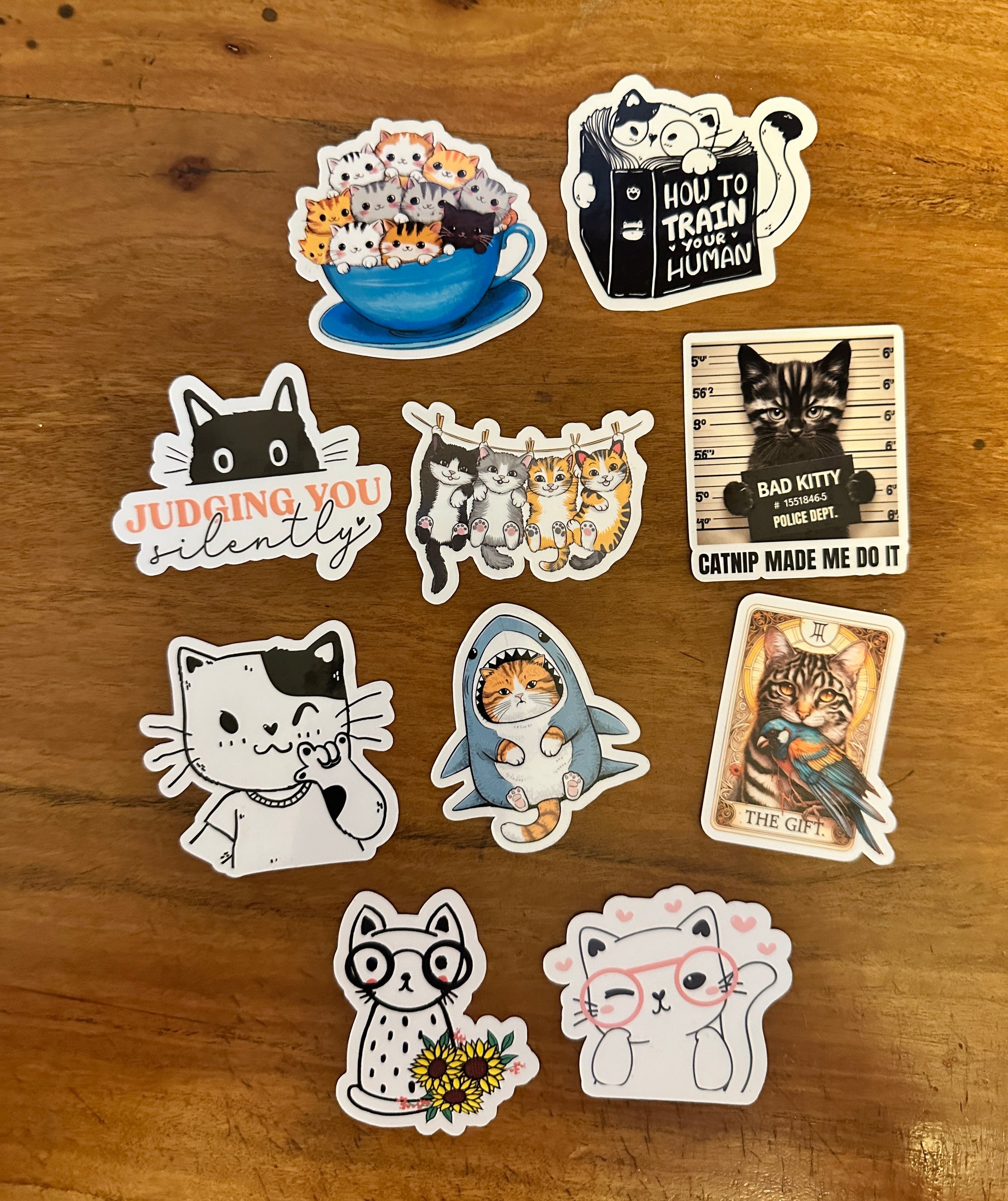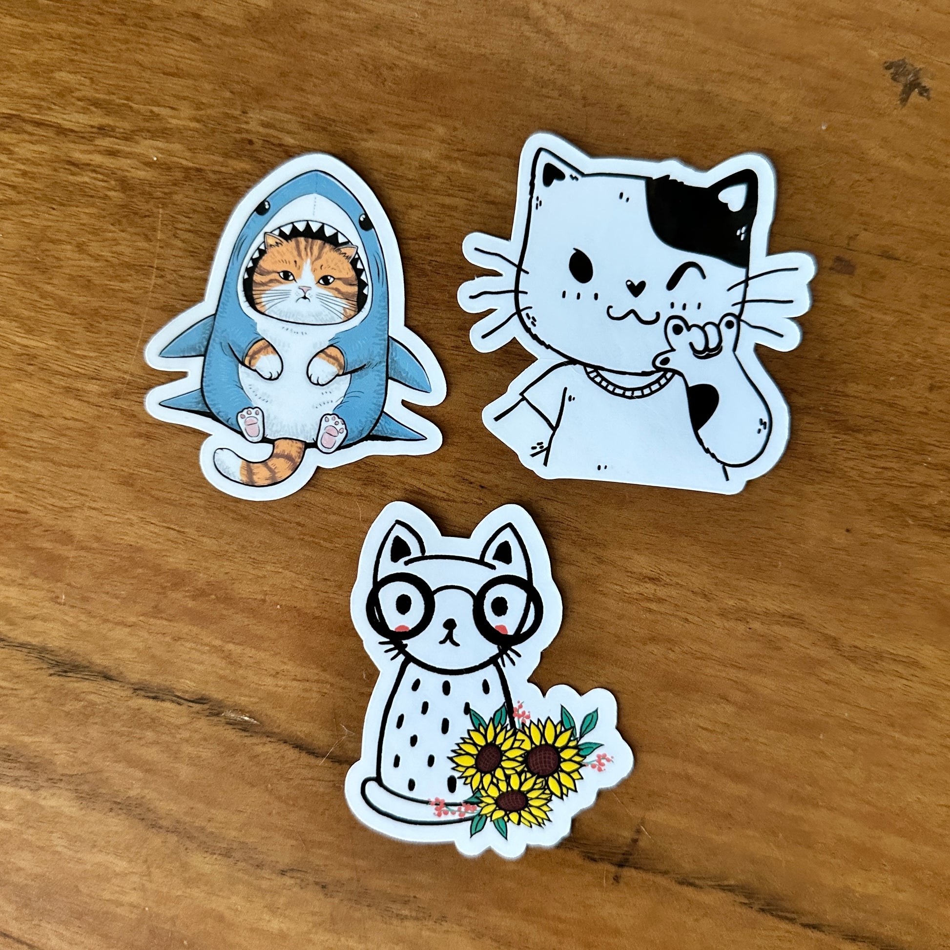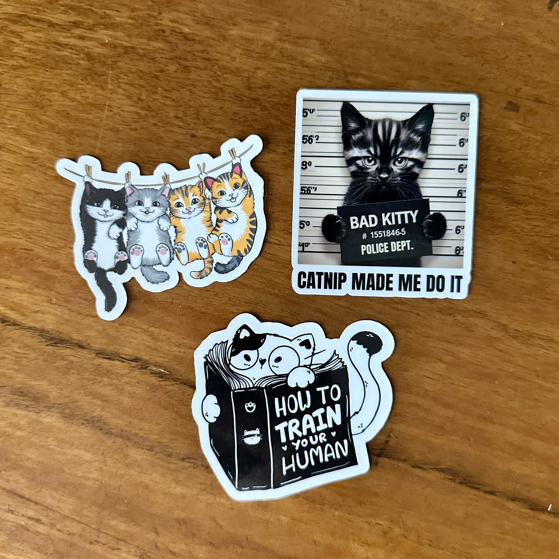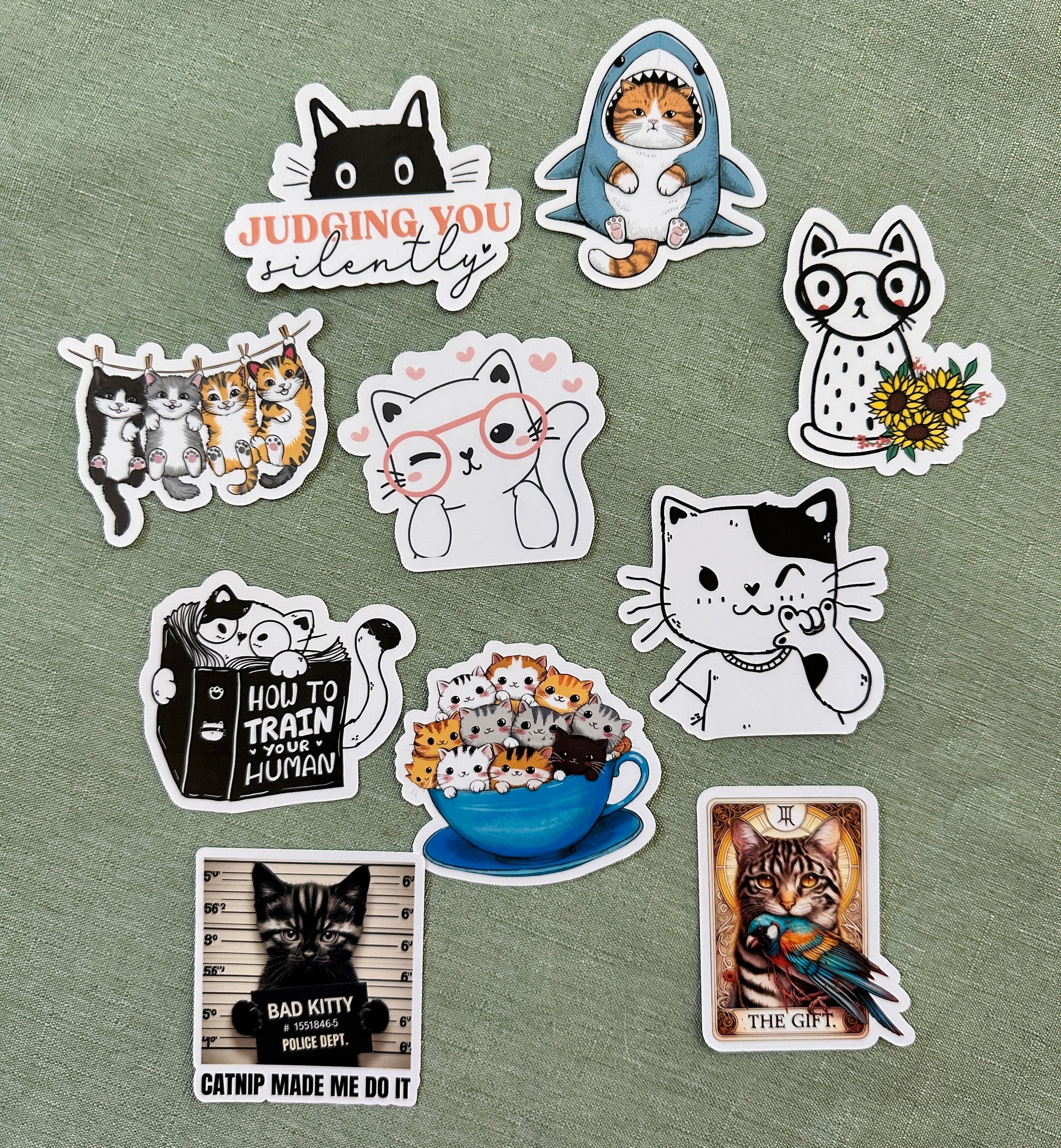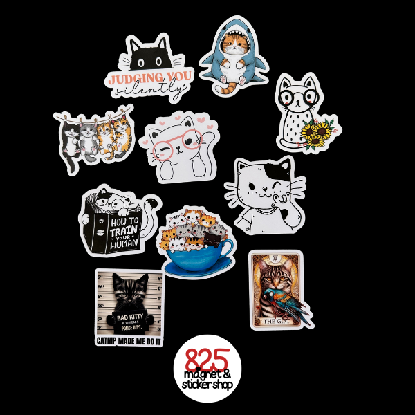 Each sticker or magnet is approx. 2.5", made from permanent vinyl, laminated, and waterproof. Perfect for decorating laptops, water bottles, journals, planners, or gifting to your fellow crazy cat crew. Every cat brings a little sass and a lot of cute!