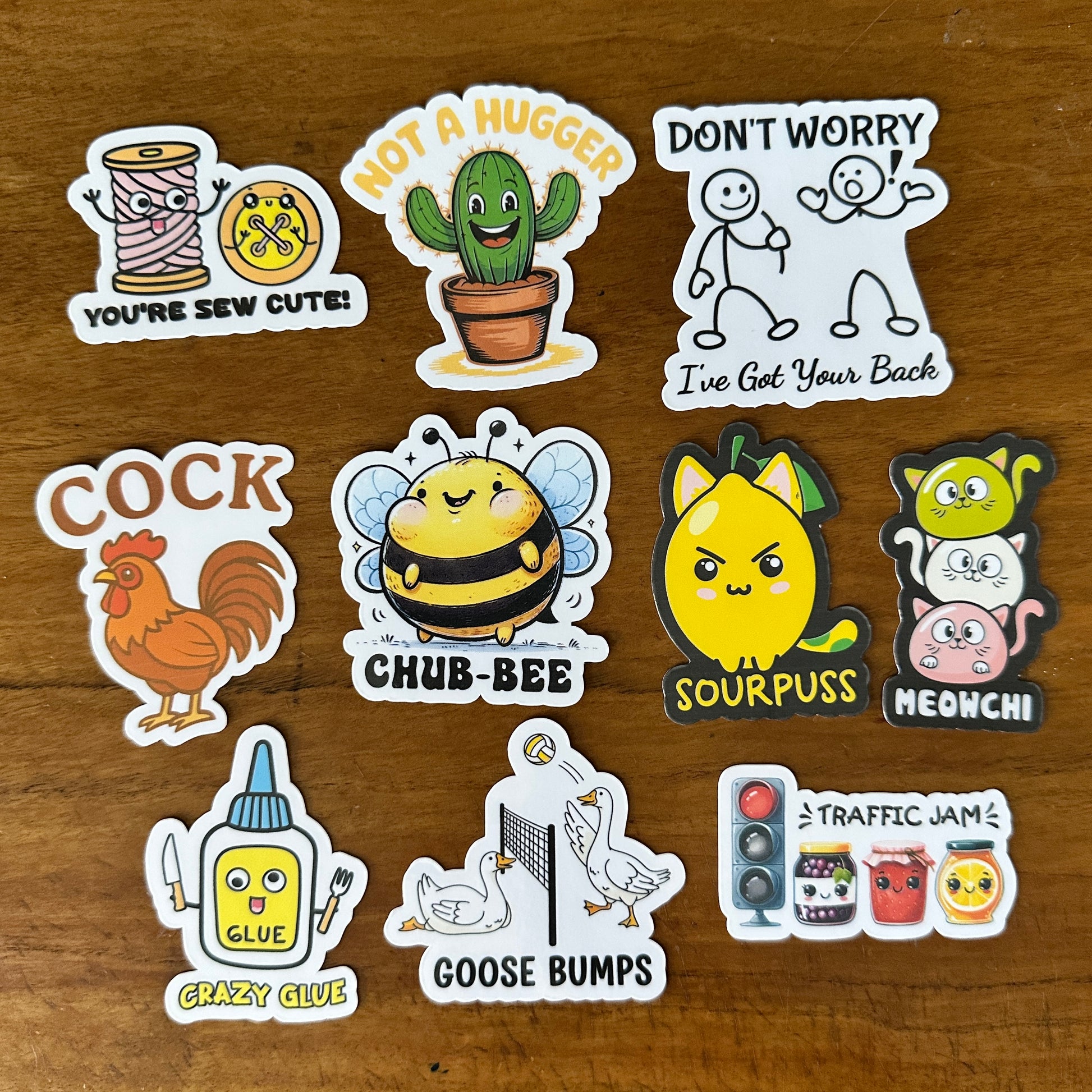 Add a dose of humor and personality to your life with this hilarious and quirky 10-piece sticker or magnet bundle! Packed with clever puns, witty sayings, and adorable characters, these high-quality vinyl designs are perfect for anyone who loves a good giggle and wants to customize their gear.
