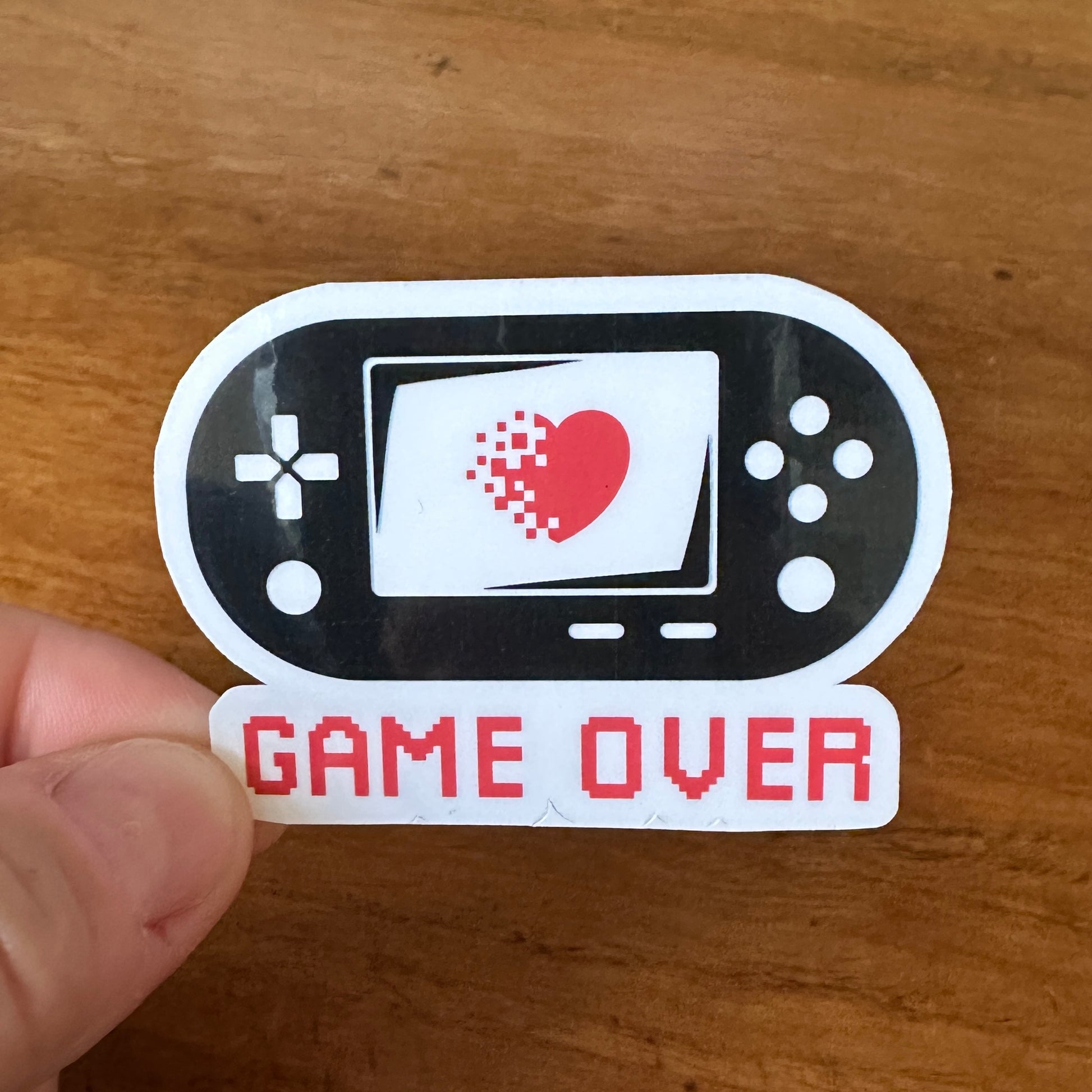 "GAME OVER" Sticker: A bold, retro-inspired design with a handheld console and a heart.