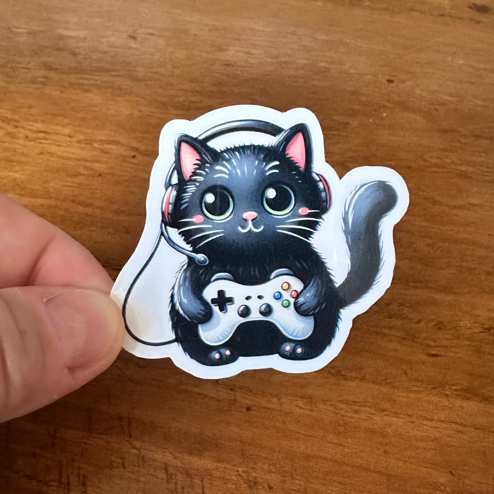 Gamer Cat Sticker: An adorable black cat focused on the game, complete with a controller.