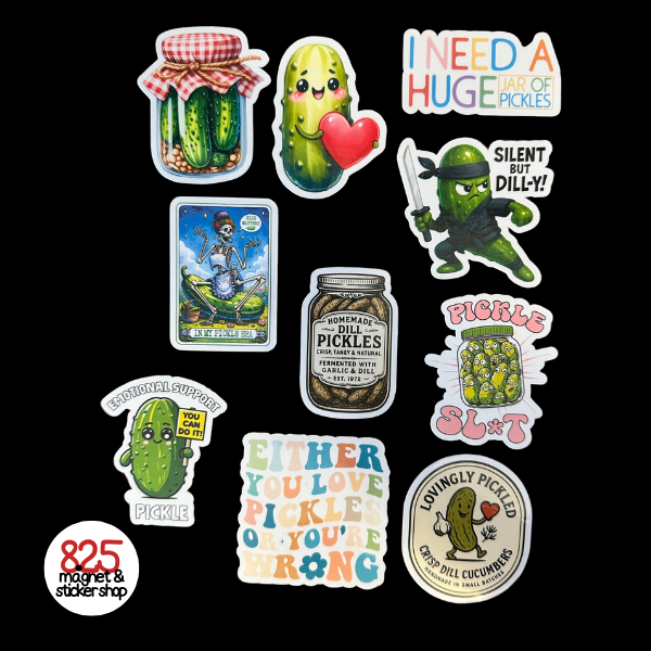 Are you obsessed with all things pickles? Then this bundle is a big dill! Our funny and flavorful pickle-themed designs are available as either high-quality stickers or durable magnets, adding a zesty twist to your belongings. Whether you're a fan of dill, a lover of all things briny, or just need a good laugh, this collection is for you.