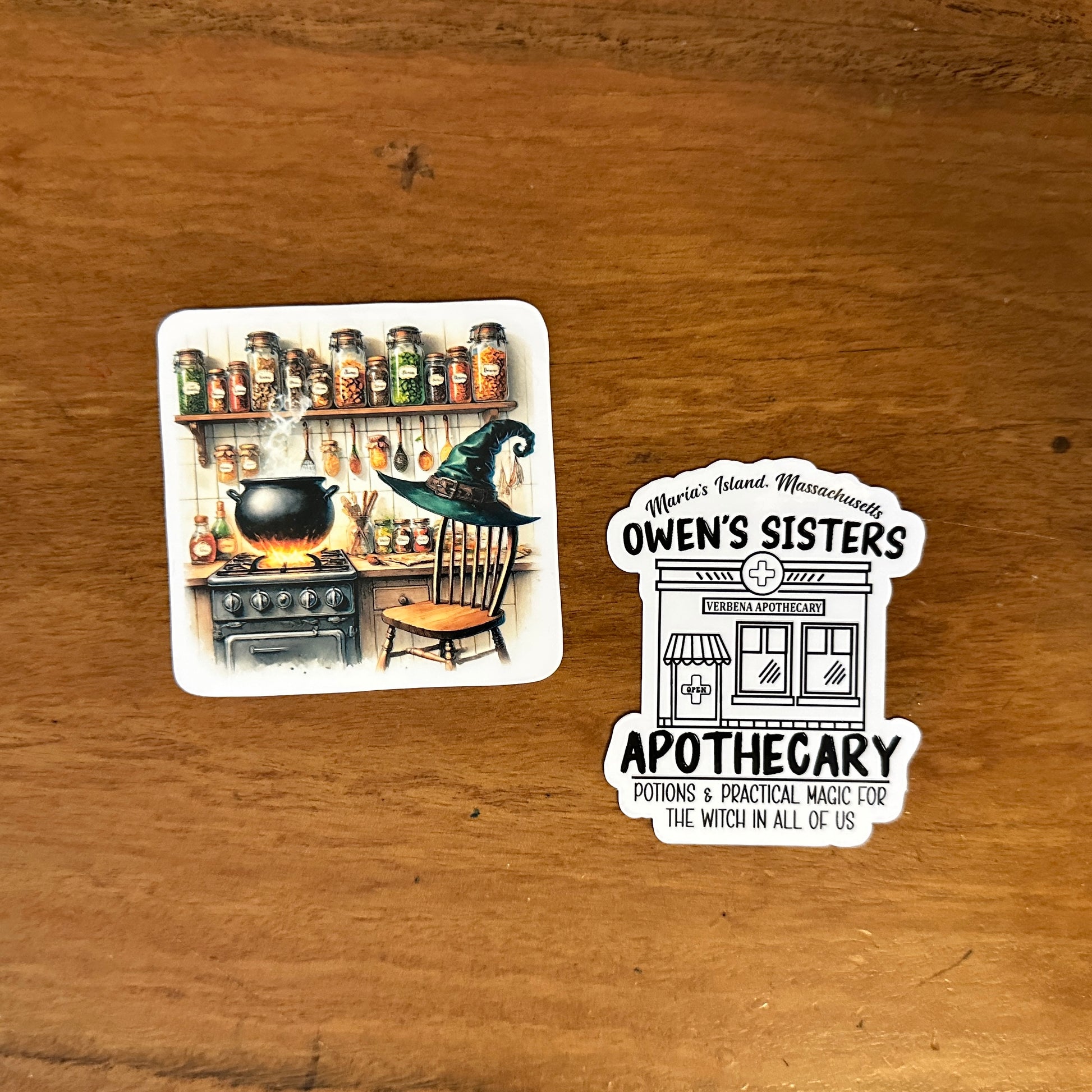 - Inspired by Owen's Sisters Apothecary Sticker: A vintage-style shop front reminiscent of that beloved island apothecary, with "Potions & Practical Magic".